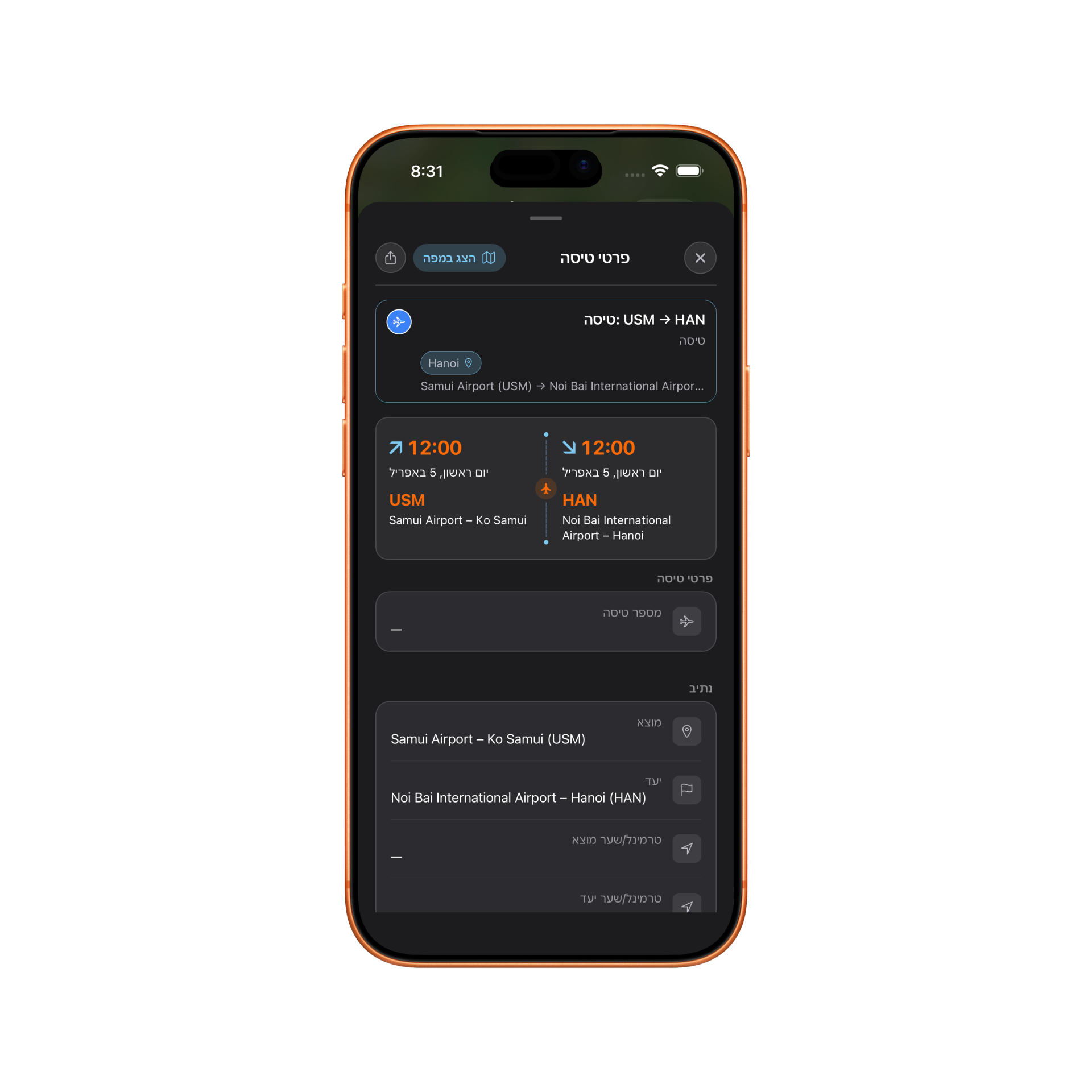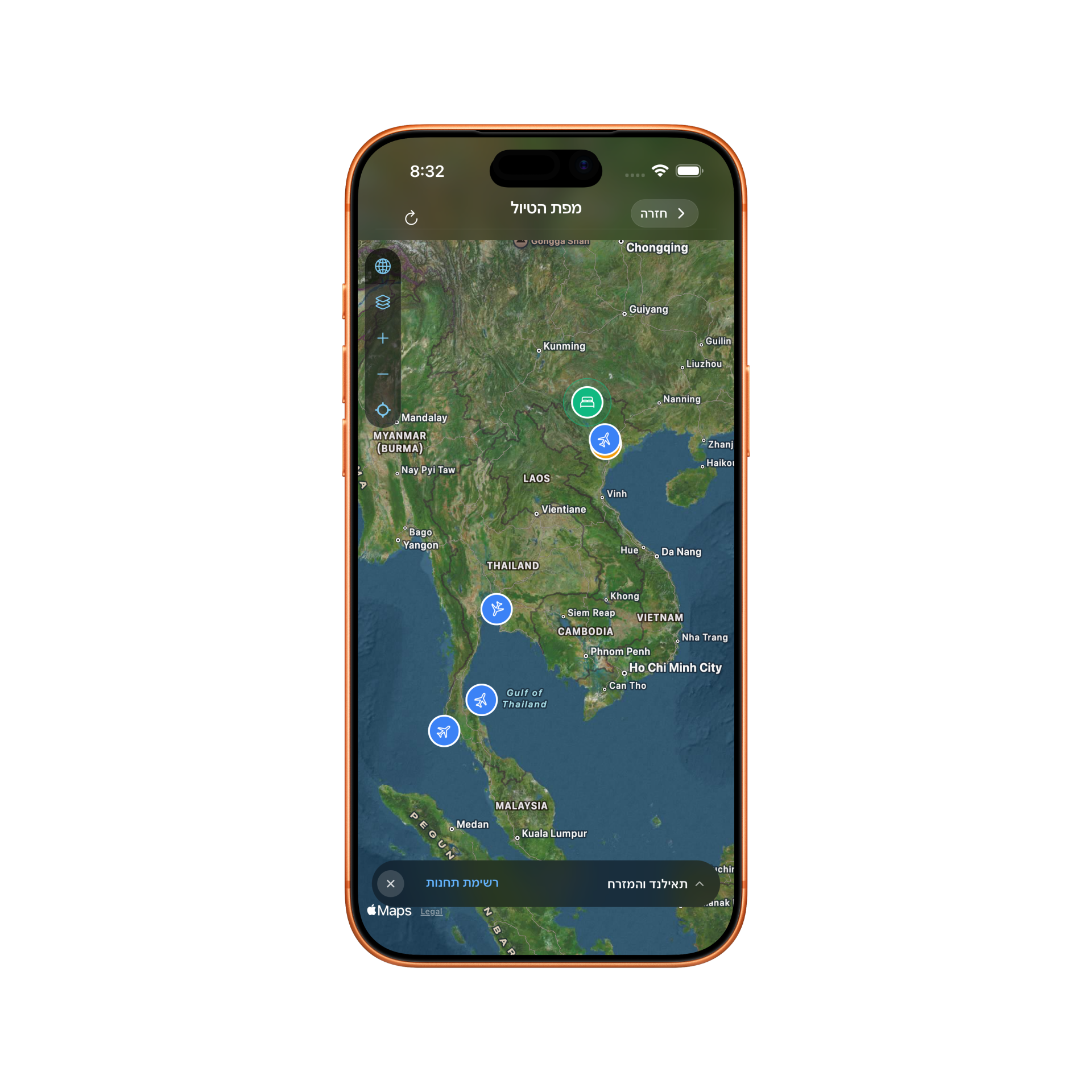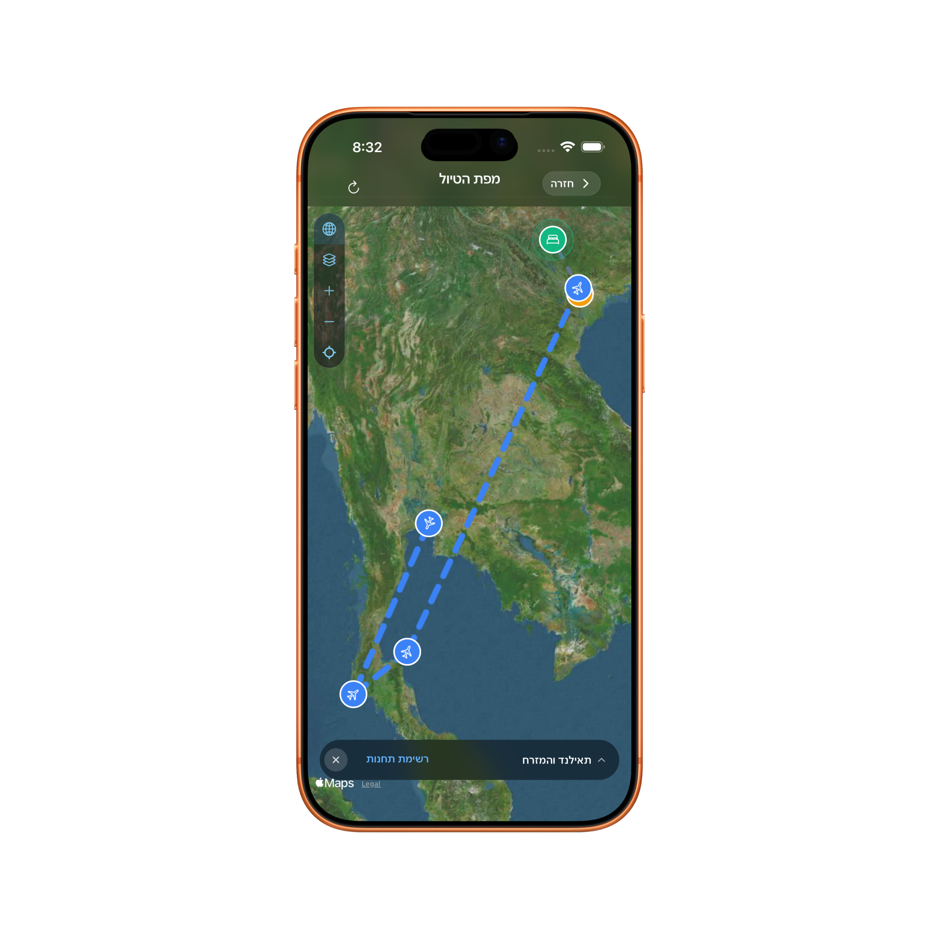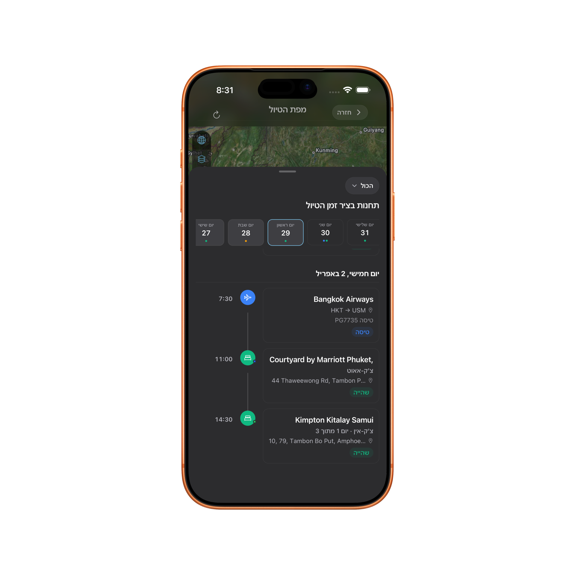 המסלול שלכם מוצג על גבי מפה אינטראקטיבית, וכל הפעילויות מסודרות בציר זמן אחד ברור: שהיות ומלונות, טיסות, פעילויות שהוזמנו מראש, השכרת רכב ואטרקציות. הטיסה מתעכבת או משתנה? תקבלו עדכונים בזמן אמת על שינויי שער, טרמינל, עיכובים או ביטולים. כל הטיסות שלכם מנוטרות באופן רציף, והתראות נשלחות ישירות לנייד כדי שתישארו תמיד מעודכנים.