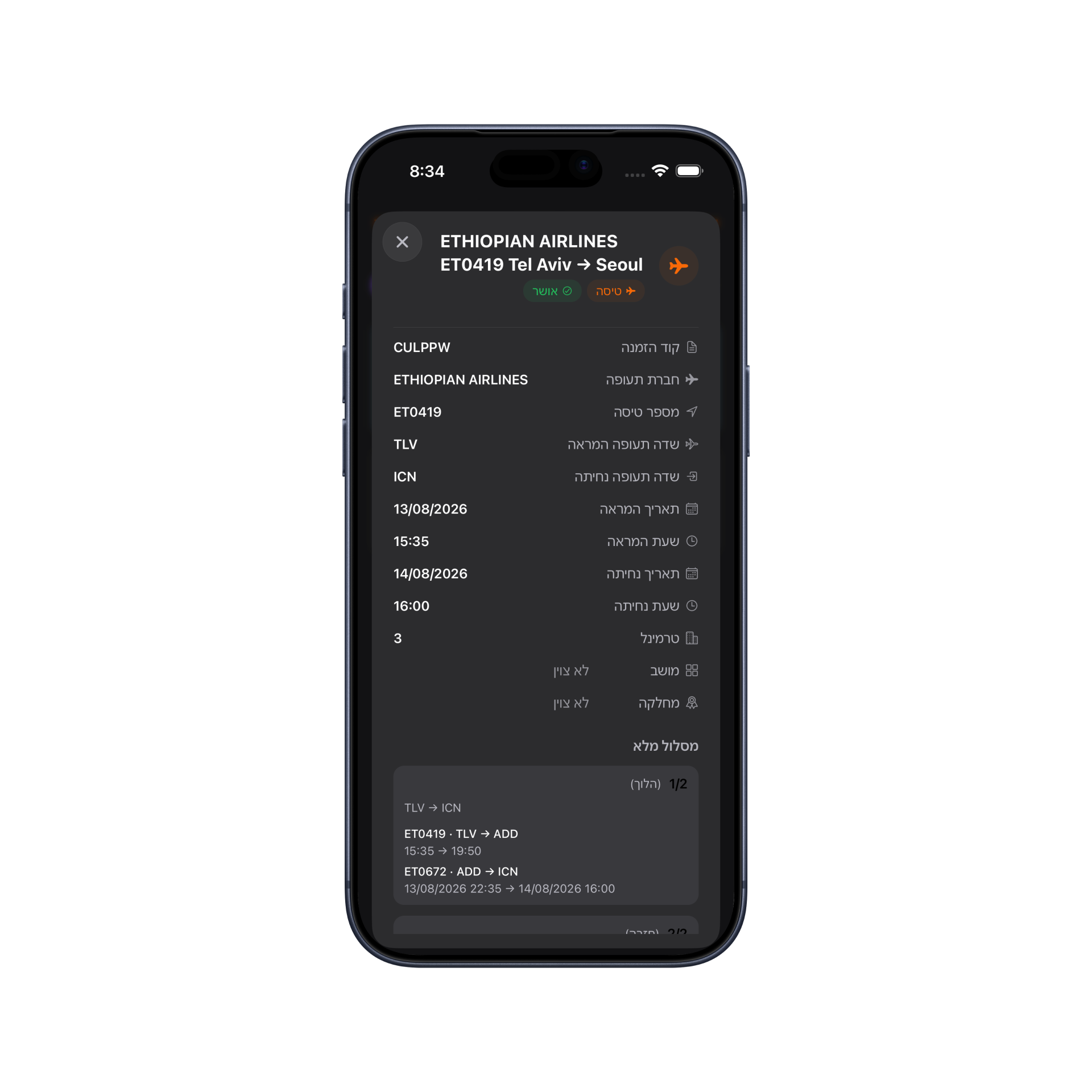 - אין צורך לחפש מספרי הזמנות, מספר מושב בטיסה, כתובות או פרטים במיילים ובווטסאפ, הכול מרוכז במקום אחד באפליקציה