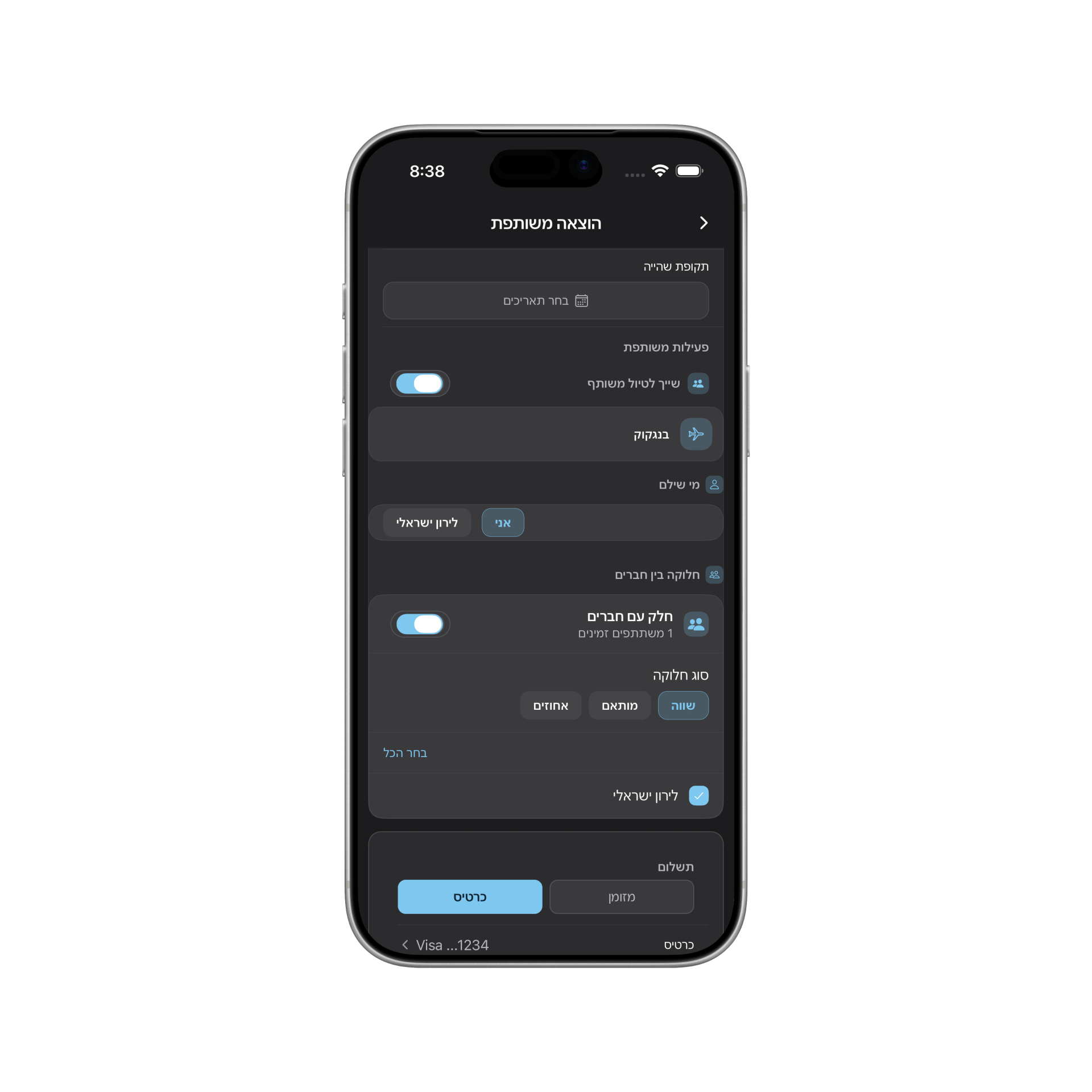רואים כמה יצא ומה נשאר, מקבלים עדכונים כשהטיסה זזה, ומשתפים הוצאות עם חברים בלי בלבול. פחות ניהול — יותר טיול.
