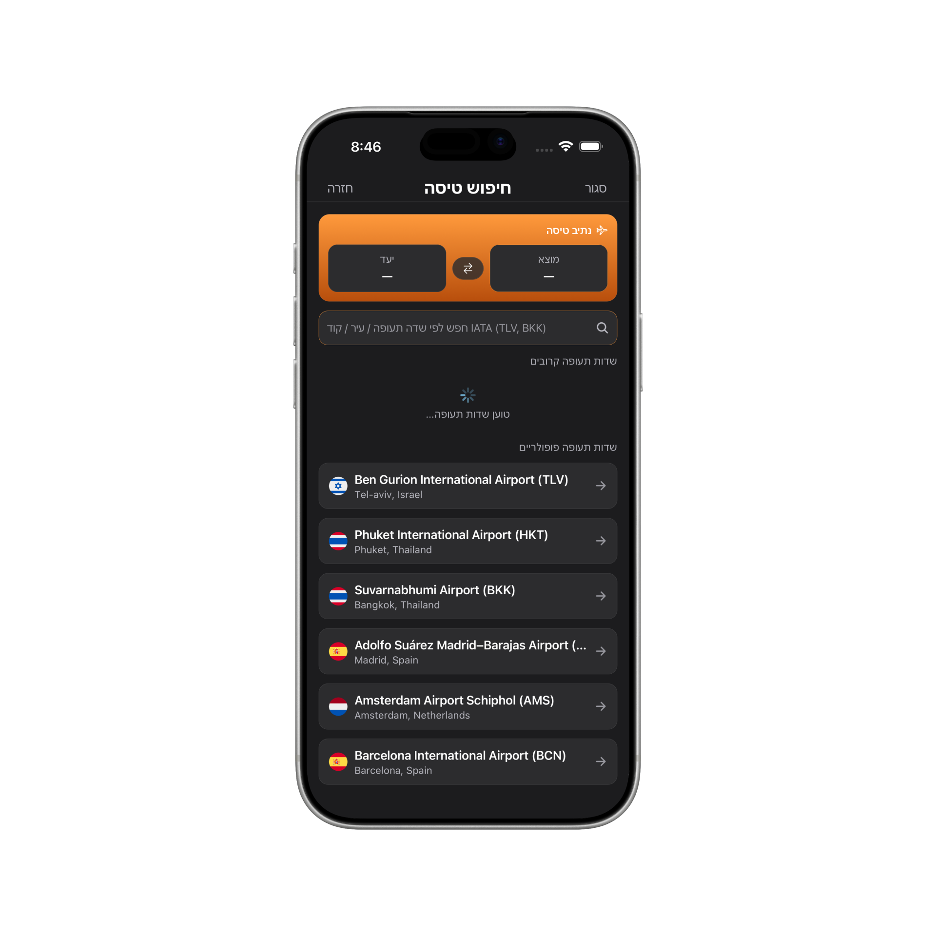 מחפשים טיסה לפי מספר טיסה או מסלול ומקבלים סטטוס בזמן אמת: שער, מסוף, זמני המראה ונחיתה מעודכנים. הטיסה מופיעה גם על מפת המסלול.