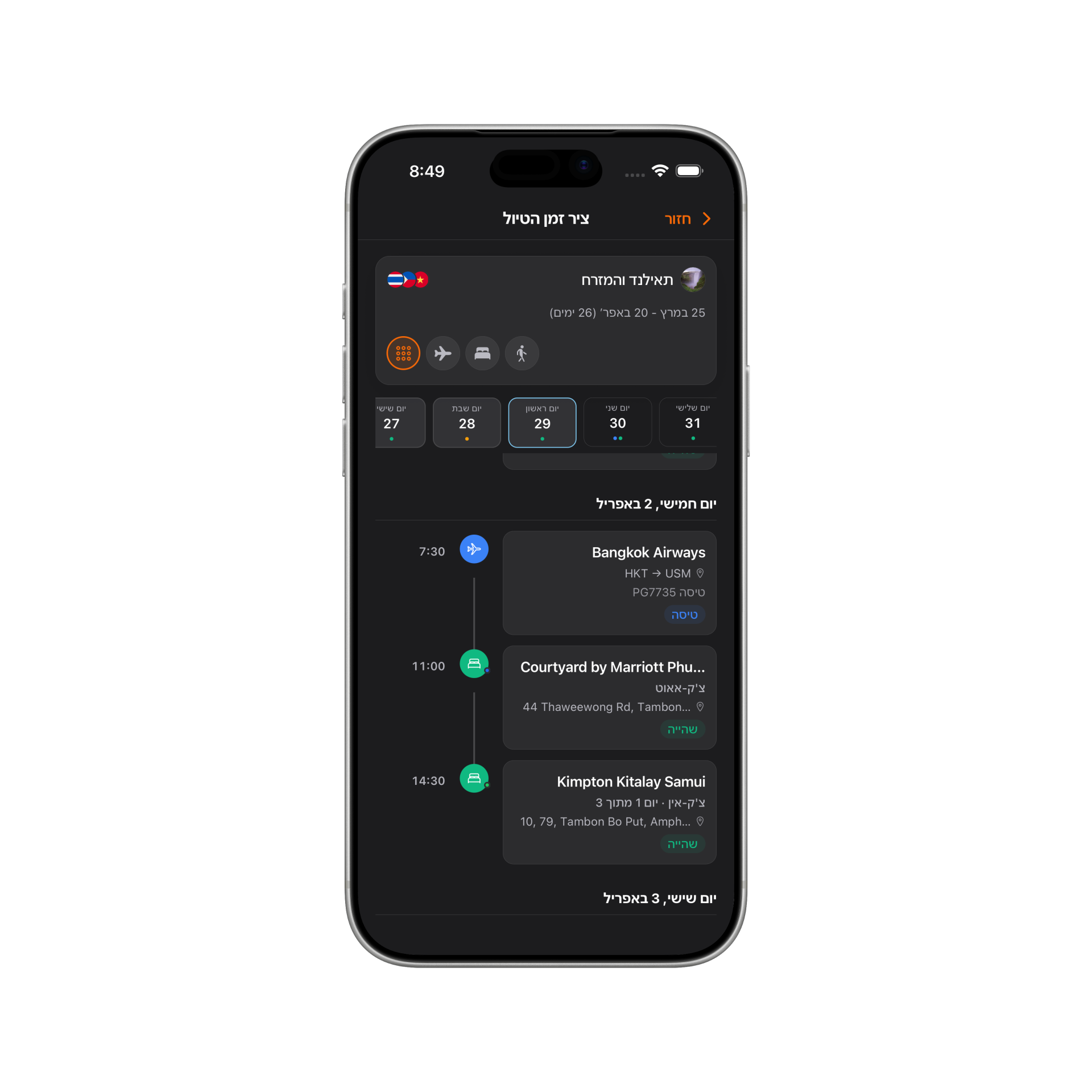 טיסות, מלונות, אטרקציות ותחבורה, הכל מרוכז בלוח זמנים אחד לפי ימים ושעות. מעבירים הזמנות מהמייל לאפליקציה, הן נקלטות אוטומטית ונכנסות ללו״ז.